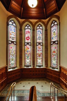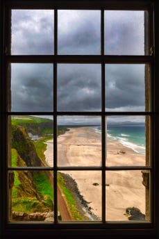 A door and three windows with terrific views open to the four cardinal points of the library of the Archbishop of Derry.