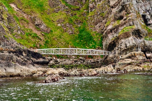 A walkway suspended 30 meters above the Atlantic allows you to reach the old salmon fishing station, now deserted.