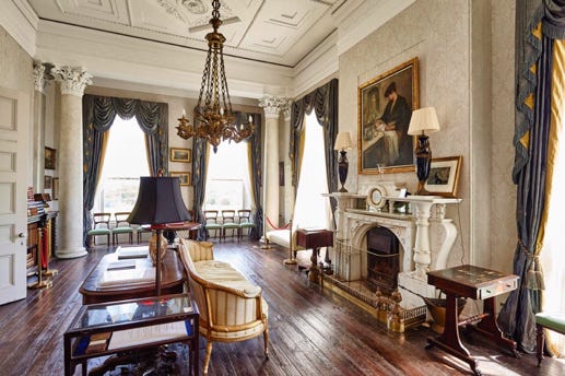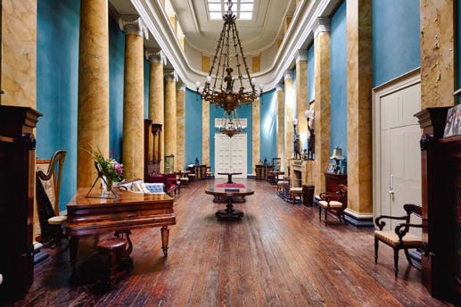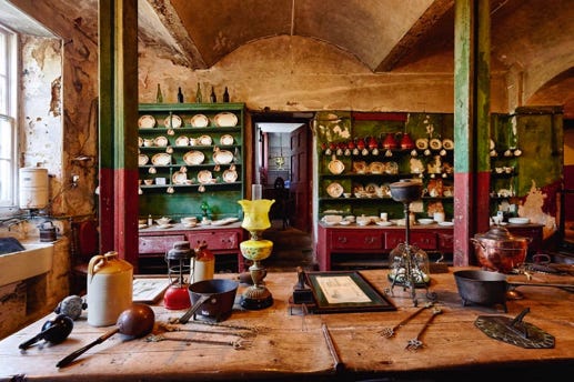 A turquoise cottage with six themed rooms, including medieval, Venetian, Roman gymnasium, Arabian night.